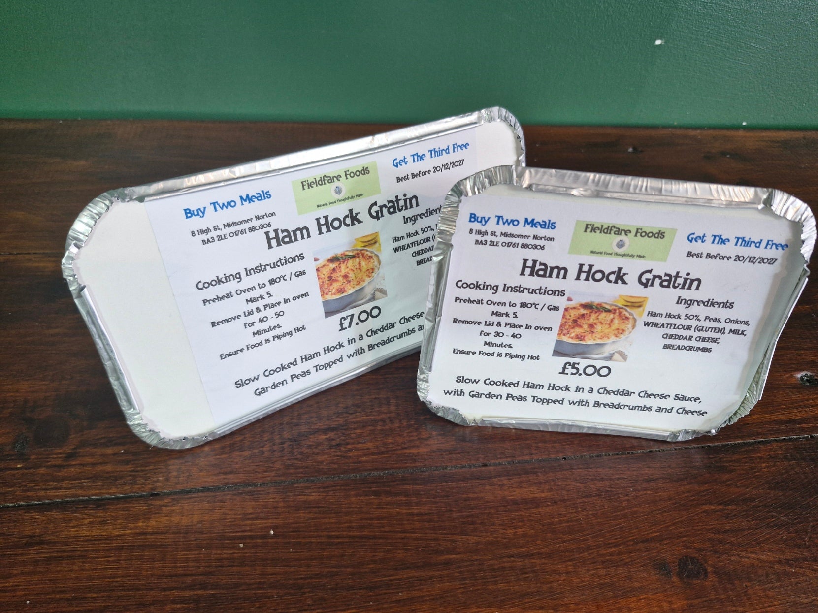 Ingredients – (Allergens in Bold) Ham Hock 50%, Peas, Onions, WHEATFLOUR (GLUTEN), MILK, CHEDDAR CHEESE, BREADCRUMBS