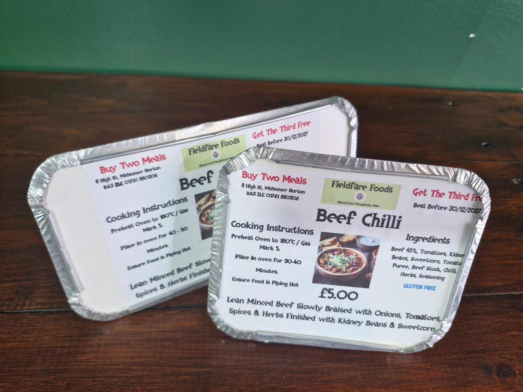 Ingredients – (Allergens in Bold) Beef 45%, Tomatoes, Kidney Beans, Sweetcorn, Tomato Puree, Beef Stock, Chilli, Herbs, Seasoning.