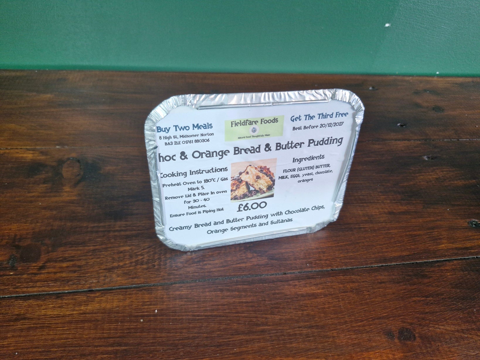 Creamy Bread and Butter Pudding with Chocolate Chips, Orange Segments and Sultanas