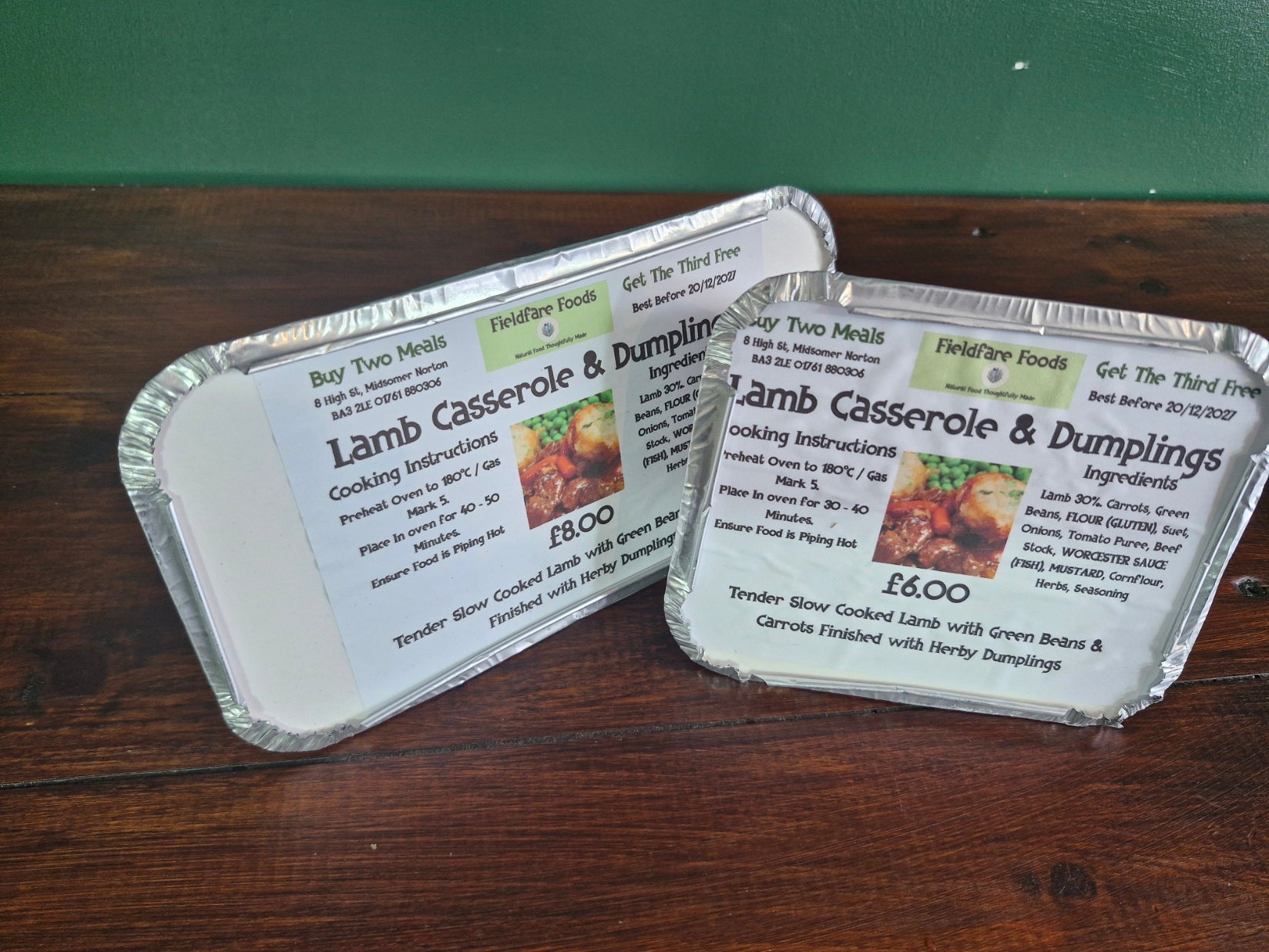 Ingredients – (Allergens in Bold) Lamb 30%, Carrots, Green Beans, Onions, Tomato Puree, Beef Stock, WORCESTER SAUCE (FISH), FLOUR (GLUTEN), Suet, MUSTARD, Garlic, Herbs, Cornflour